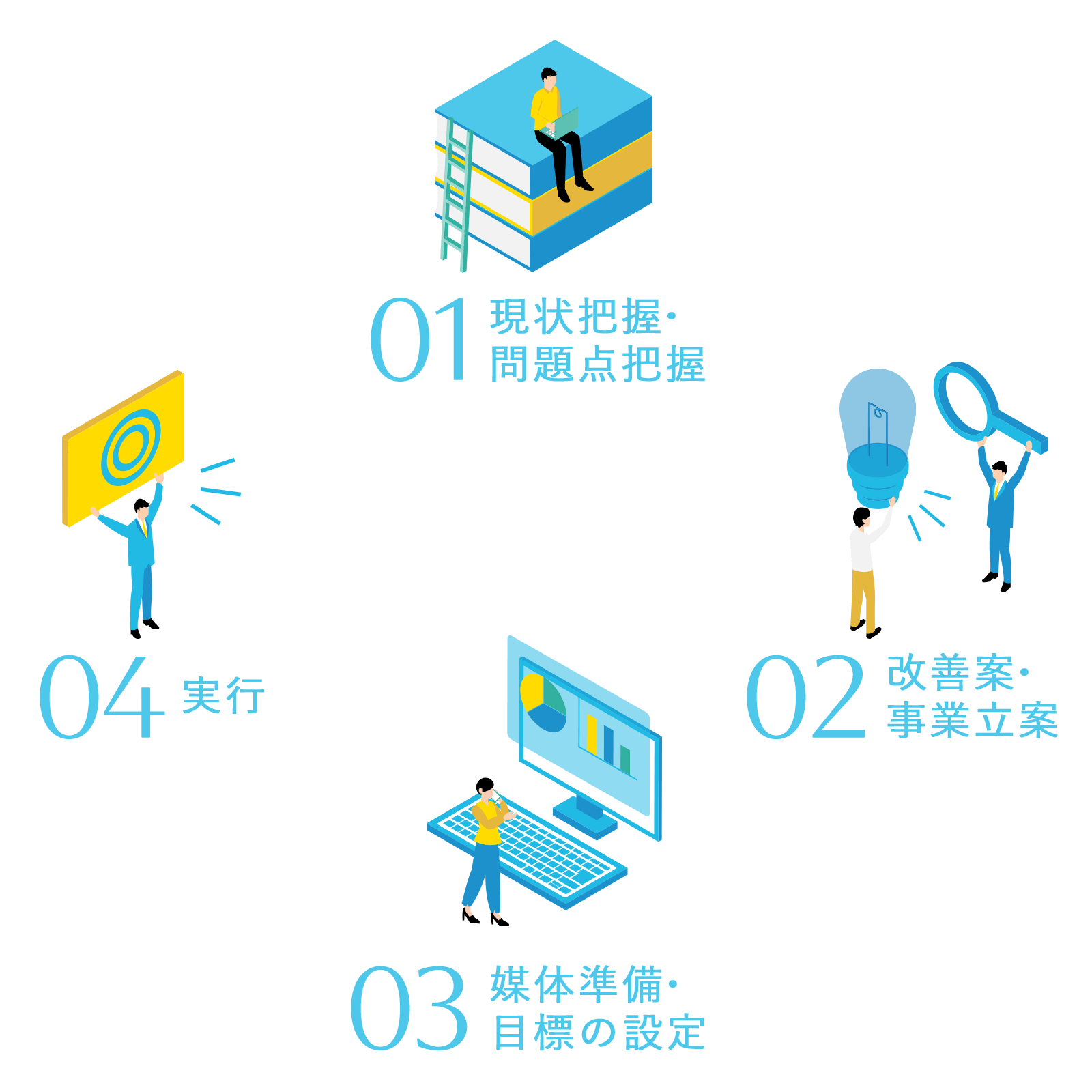 1クォーター毎にアクセス、問い合わせ、受注状況、広告予算、広告効果などの検証を行います。